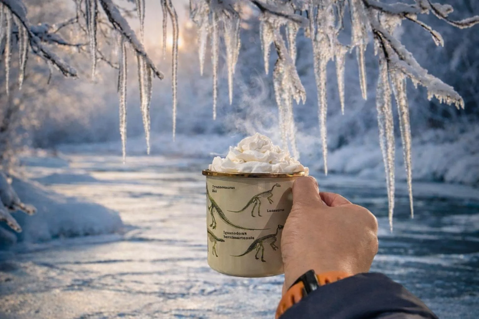 A quiet winter moment in Telemark, as April Alfarnes enjoys a mug of hot chocolate topped with whipped cream while looking out over a frozen river framed by heavy icicles. The cold air, the pale sunrise, and the stillness of the landscape turn this small sip into a warm ritual — a reminder of why winter adventures feel both intimate and profoundly alive.